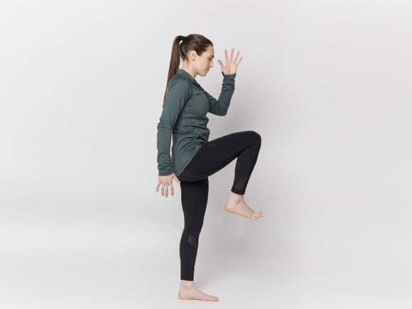 - High knees: Run in place or forward while driving knees upward and maintaining upright posture.